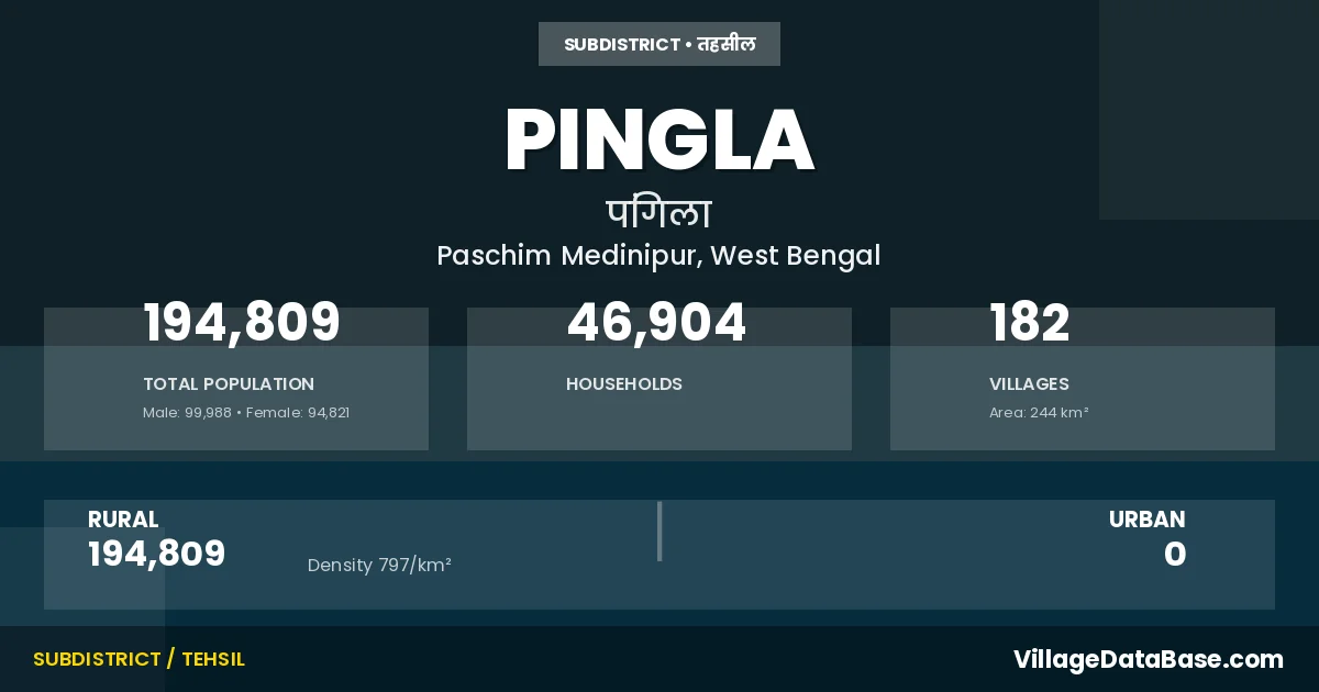 According to the 2011 census The total area of Pingla Subdivision is 244 km², with a population of 194809 people. The population density is 797 inhabitants per square kilometre, and there are approximately 46904 houses in the sub district.