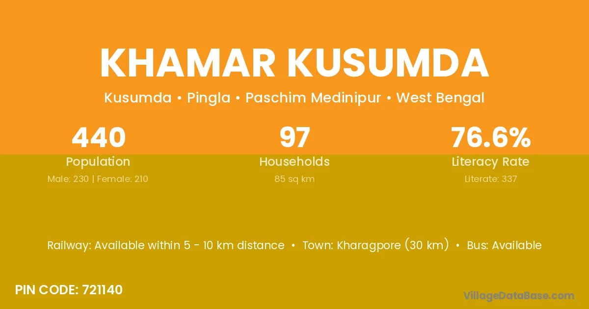 Kharagpore (30 km) is the nearest town to Khamar Kusumda village for major economic activities and is located approximately 30 km away.