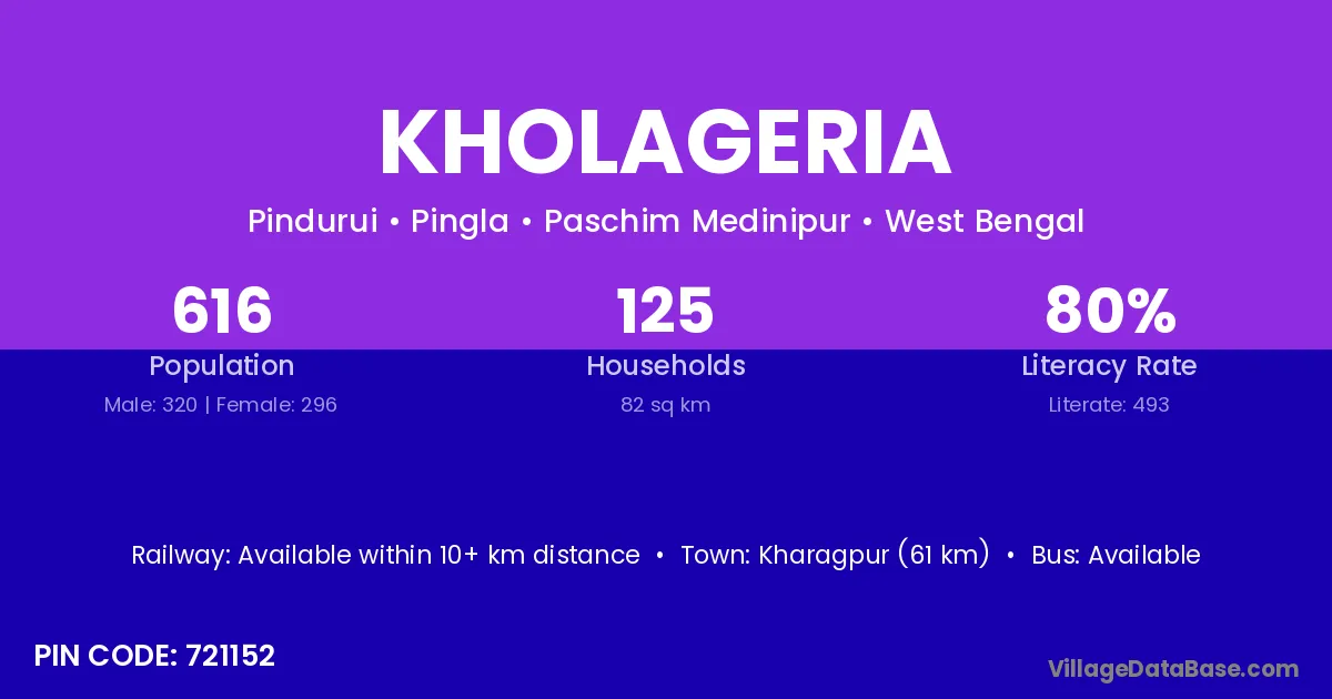 Kharagpur (61 km) is the nearest town to Kholageria village for major economic activities and is located approximately 61 km away.