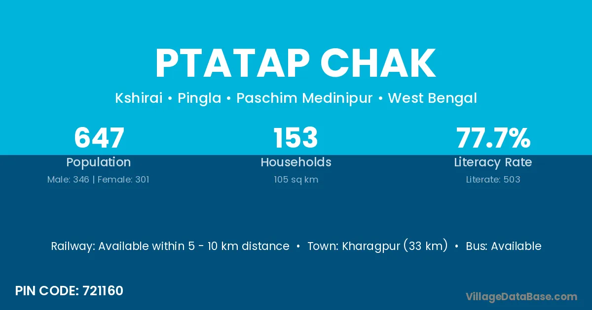 Kharagpur (33 km) is the nearest town to Ptatap Chak village for major economic activities and is located approximately 33 km away.