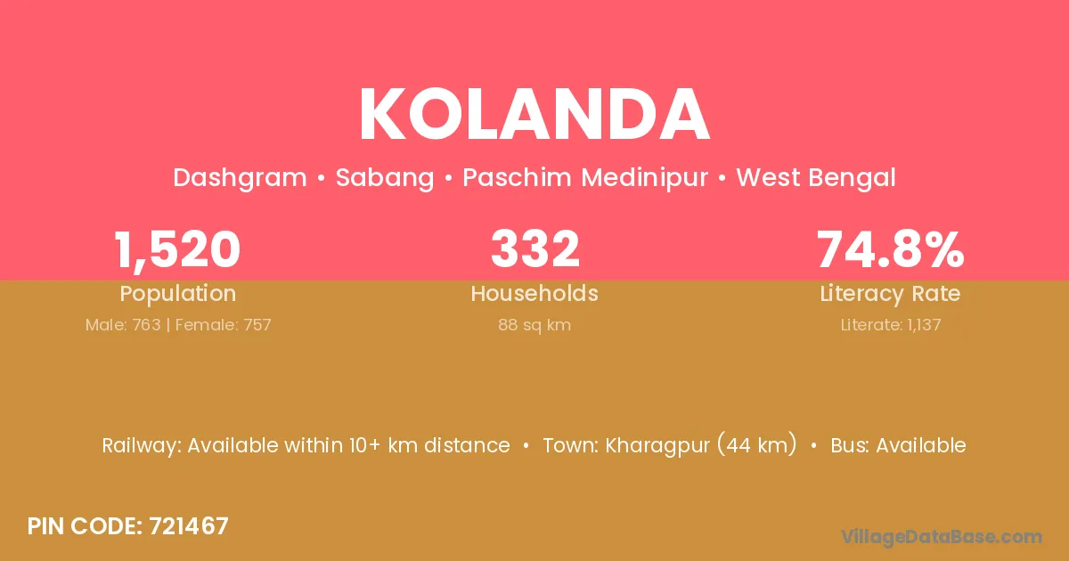 Kharagpur (44 km) is the nearest town to Kolanda village for major economic activities and is located approximately 44 km away.