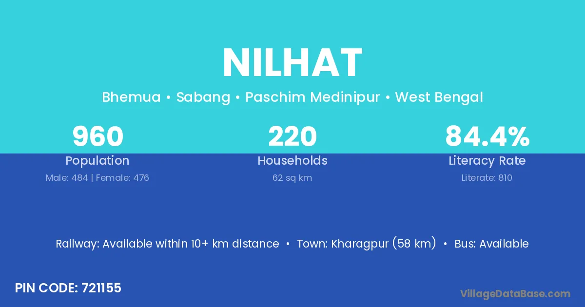Kharagpur (58 km) is the nearest town to Nilhat village for major economic activities and is located approximately 58 km away.