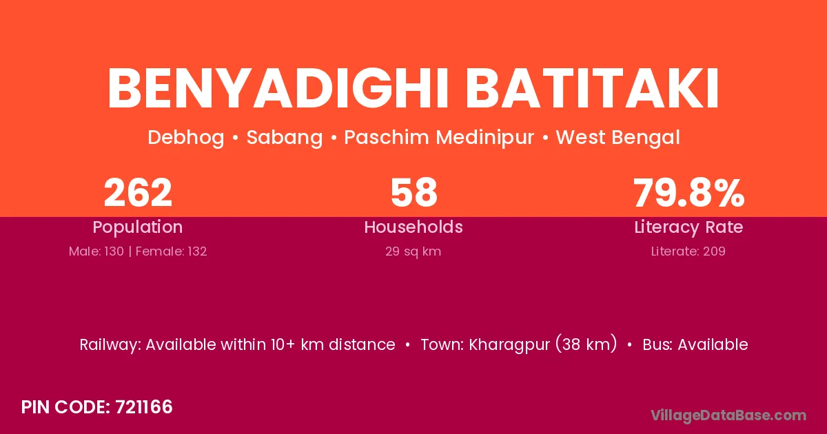 Kharagpur (38 km) is the nearest town to Benyadighi Batitaki village for major economic activities and is located approximately 38 km away.