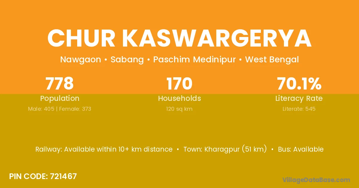 Kharagpur (51 km) is the nearest town to Chur Kaswargerya village for major economic activities and is located approximately 51 km away.