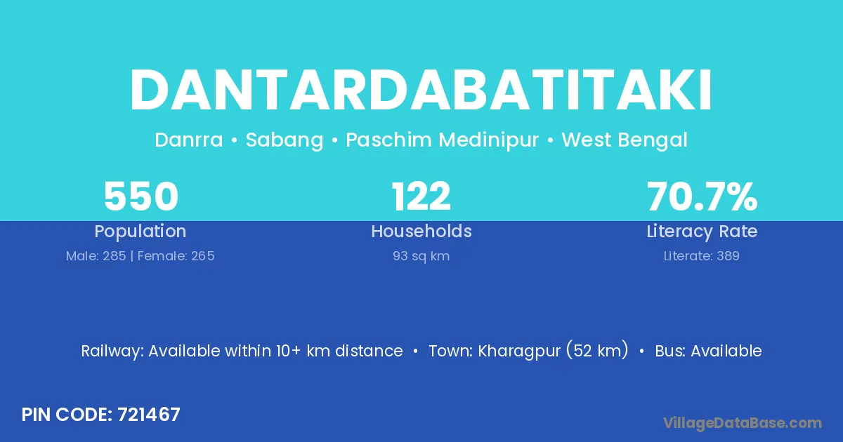Kharagpur (52 km) is the nearest town to Dantardabatitaki village for major economic activities and is located approximately 52 km away.