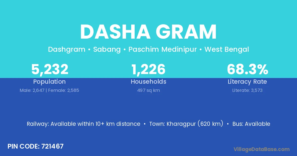 Kharagpur (620 km) is the nearest town to Dasha Gram village for major economic activities and is located approximately 620 km away.