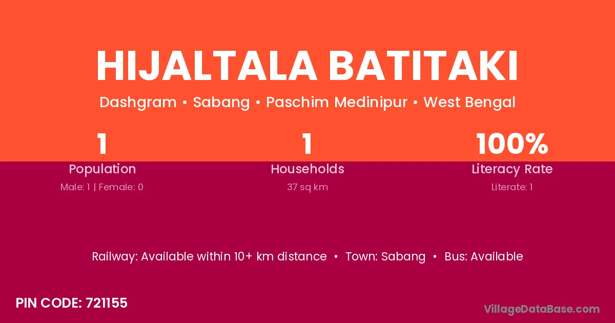 Hijaltala Batitaki village has a total population of 1 people, of which 1 are males and 0 are females.