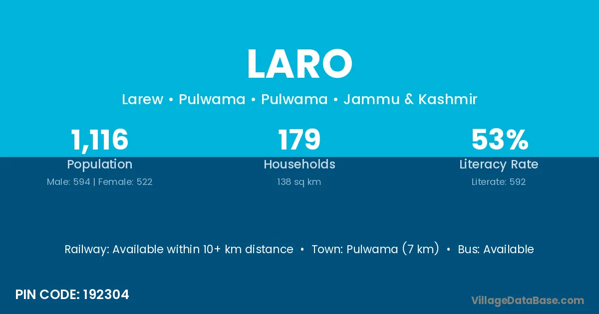 According to Census 2011 information, the village code of Laro village is 721144.