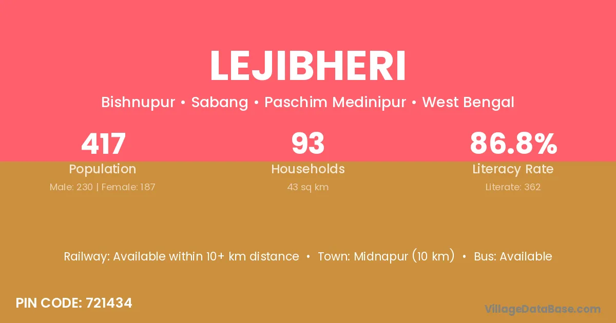 Midnapur (10 km) is the nearest town to Lejibheri village for major economic activities and is located approximately 10 km away.