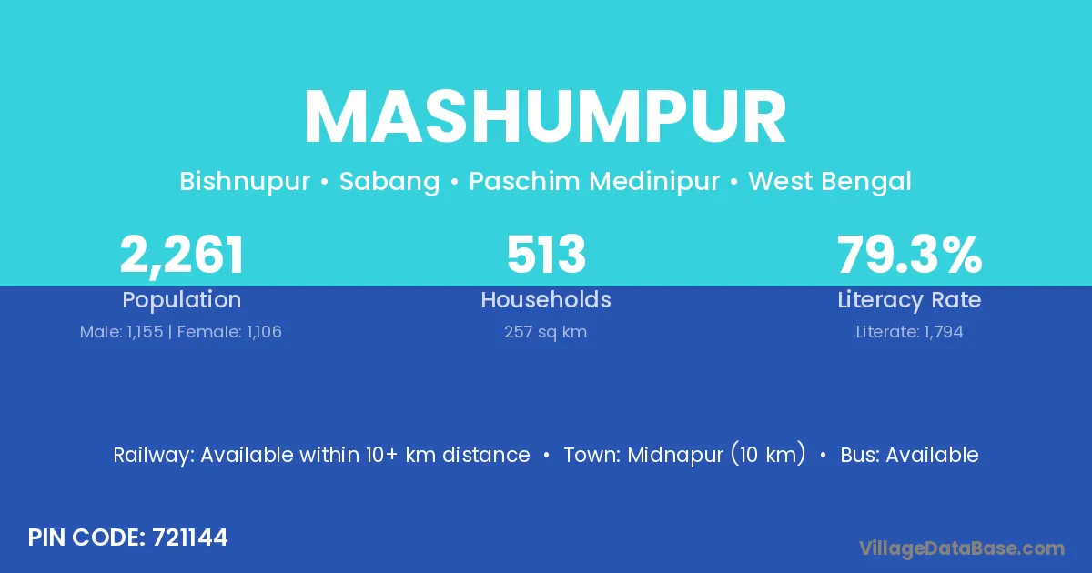Midnapur (10 km) is the nearest town to Mashumpur village for major economic activities and is located approximately 10 km away.