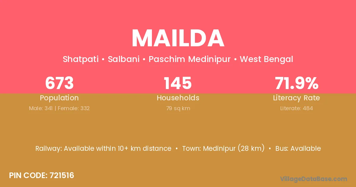 Medinipur (28 km) is the nearest town to Mailda village for major economic activities and is located approximately 28 km away.