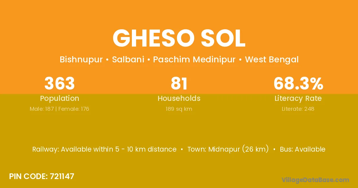 Midnapur (26 km) is the nearest town to Gheso Sol village for major economic activities and is located approximately 26 km away.