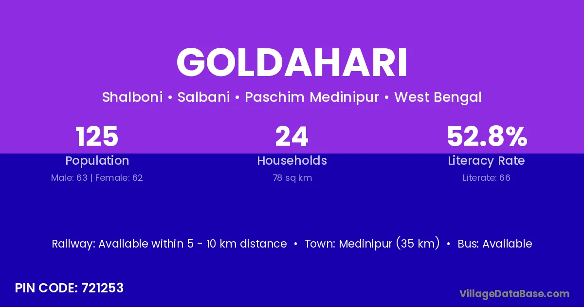 Medinipur (35 km) is the nearest town to Goldahari village for major economic activities and is located approximately 35 km away.