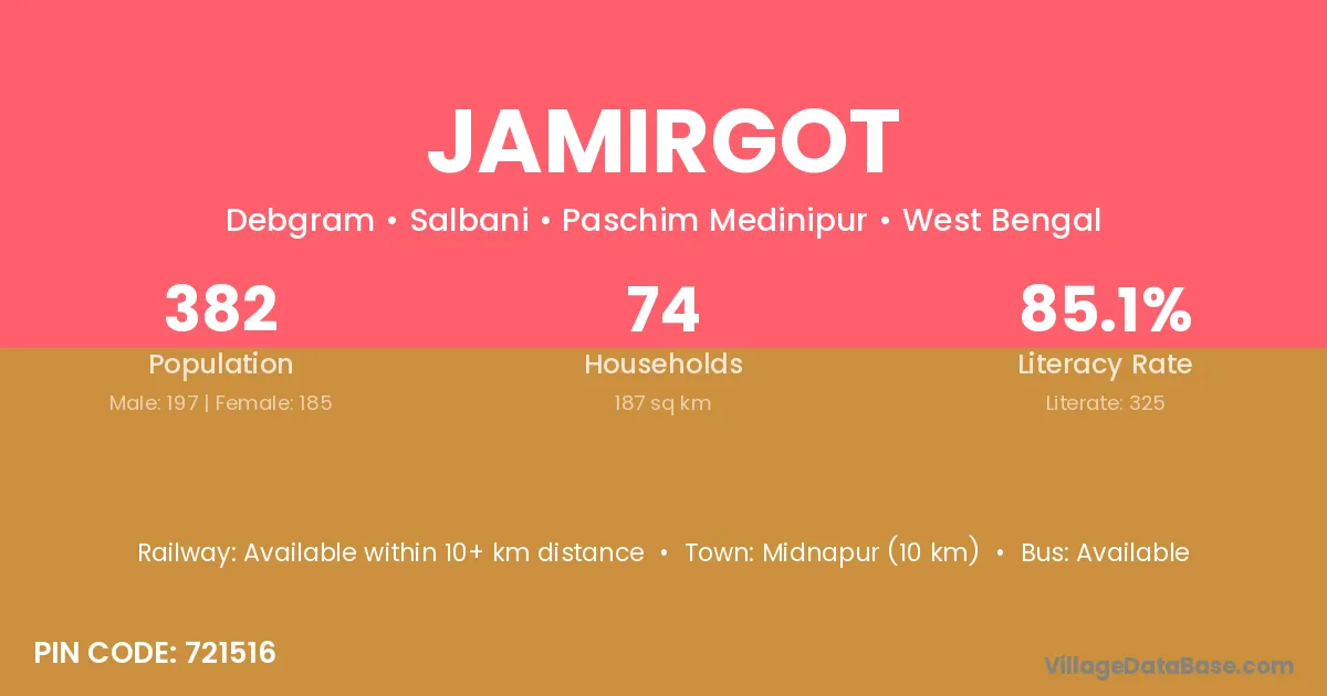 Midnapur (10 km) is the nearest town to Jamirgot village for major economic activities and is located approximately 10 km away.