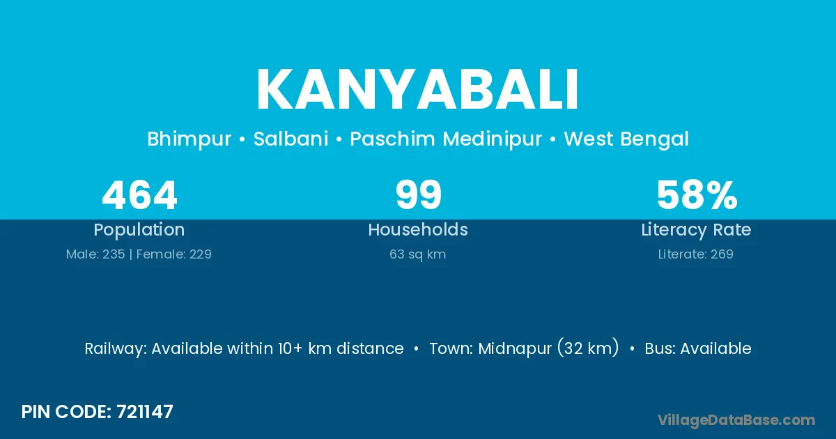 Midnapur (32 km) is the nearest town to Kanyabali village for major economic activities and is located approximately 32 km away.