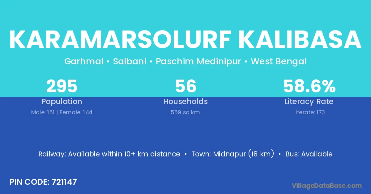 Midnapur (18 km) is the nearest town to Karamarsolurf Kalibasa village for major economic activities and is located approximately 18 km away.