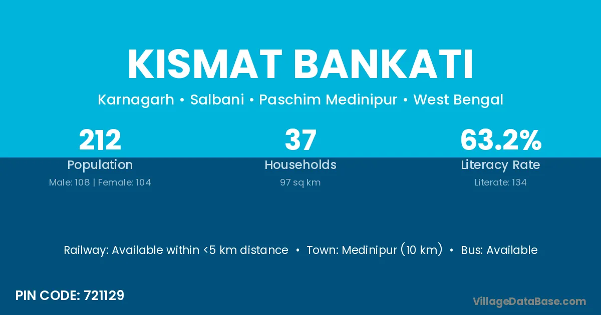 Medinipur (10 km) is the nearest town to Kismat Bankati village for major economic activities and is located approximately 10 km away.