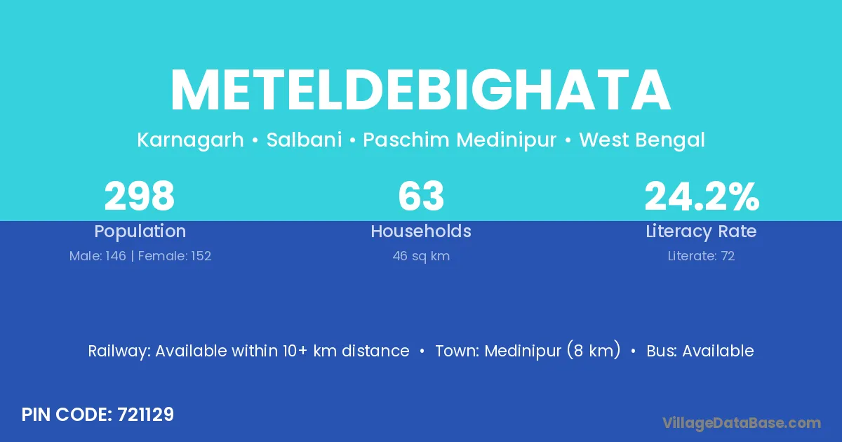 Medinipur (8 km) is the nearest town to Meteldebighata village for major economic activities and is located approximately 8 km away.