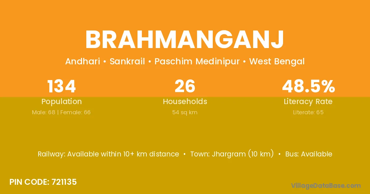 Jhargram (10 km) is the nearest town to Brahmanganj village for major economic activities and is located approximately 10 km away.