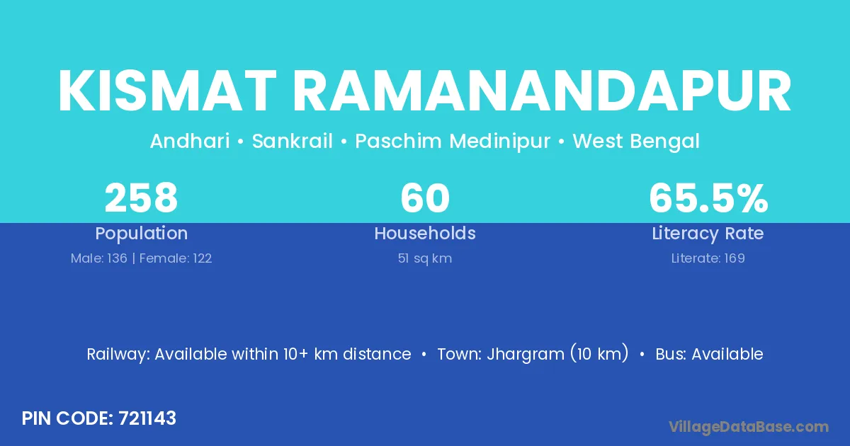 Jhargram (10 km) is the nearest town to Kismat Ramanandapur village for major economic activities and is located approximately 10 km away.