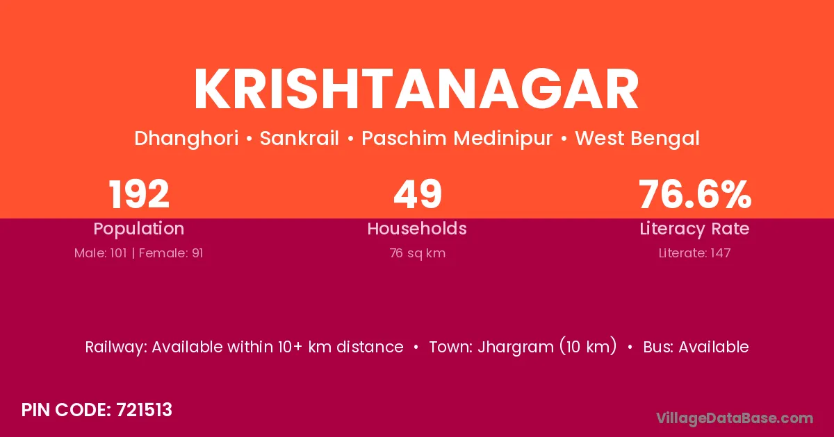 Jhargram (10 km) is the nearest town to Krishtanagar village for major economic activities and is located approximately 10 km away.