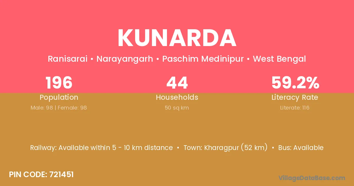 Jhargram (10 km) is the nearest town to Kunarda village for major economic activities and is located approximately 10 km away.