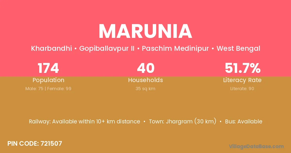 Marunia village is located in the Sankrail Subdivision of the Paschim Medinipur district in West Bengal.