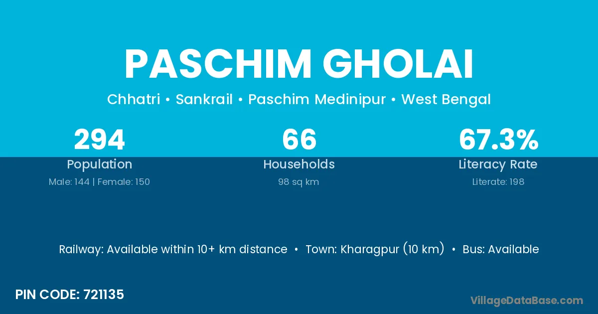 Kharagpur (10 km) is the nearest town to Paschim Gholai village for major economic activities and is located approximately 10 km away.