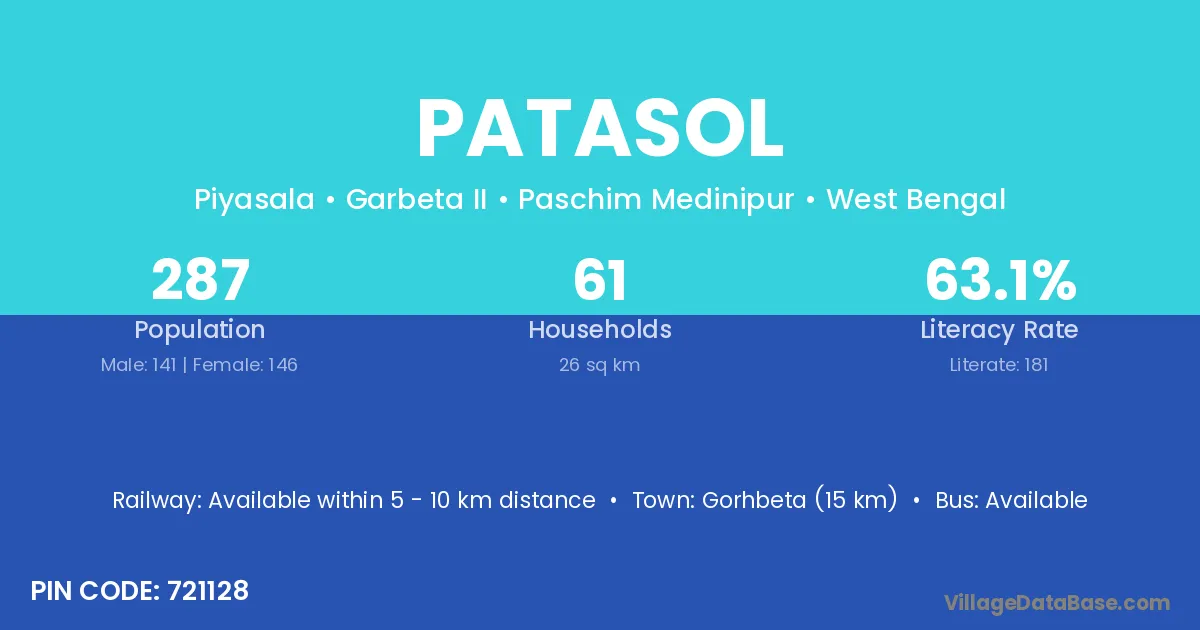 Kharagpur (45 km) is the nearest town to Patasol village for major economic activities and is located approximately 45 km away.