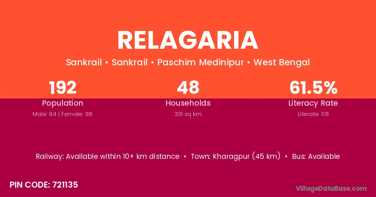 Kharagpur (45 km) is the nearest town to Relagaria village for major economic activities and is located approximately 45 km away.