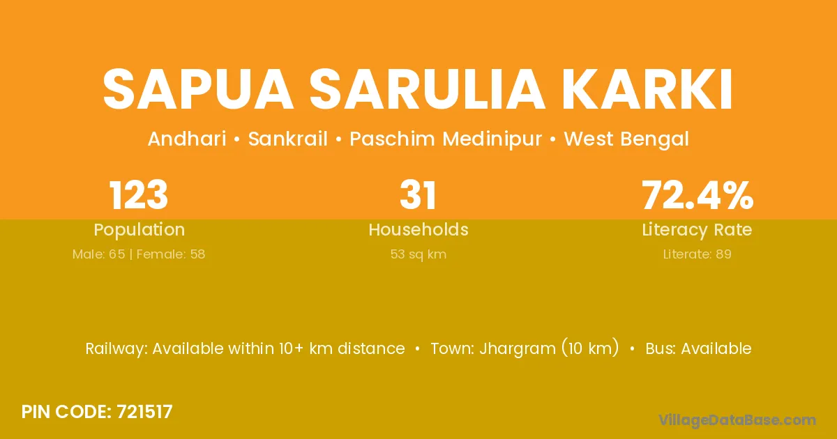 Jhargram (10 km) is the nearest town to Sapua Sarulia Karki village for major economic activities and is located approximately 10 km away.