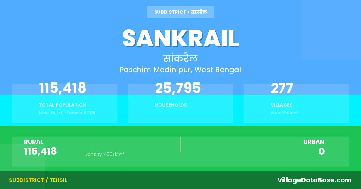 Sankrail is a town and Subdivision in the Paschim Medinipur district of the West Bengal. In India, a Subdivision is a subdivision of a district responsible for the administration and revenue collection of a specific area within the district. Subdivisions play a crucial role in the local governance structure, contributing significantly to the development and administration of their communities.