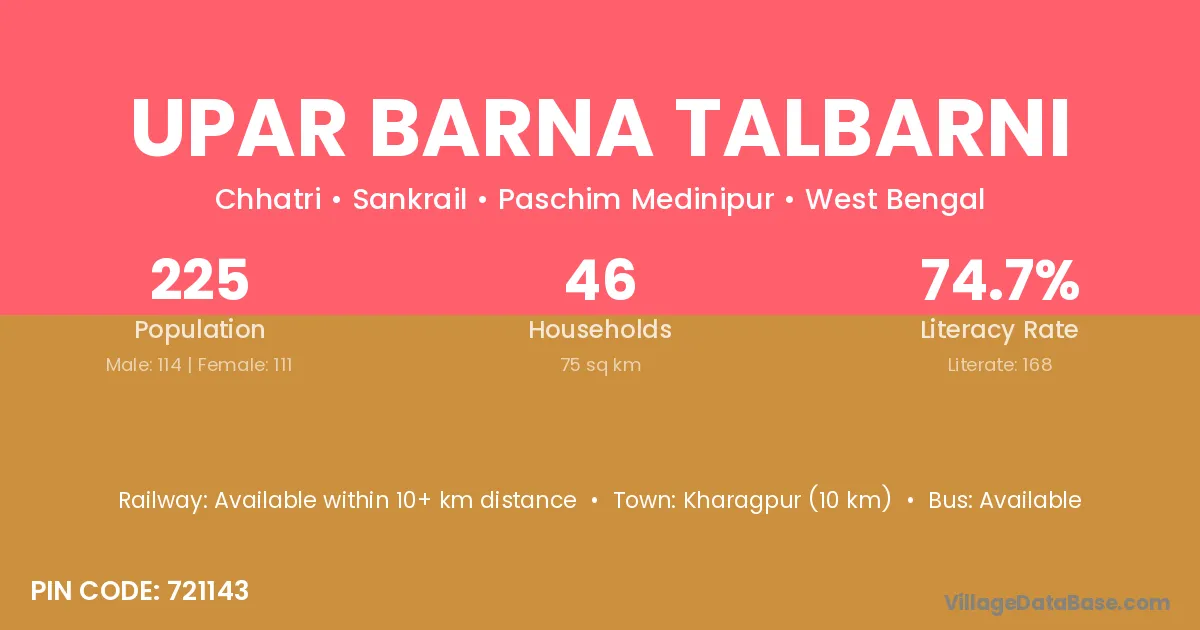 According to Census 2011 information, the village code of Upar Barna Talbarni village is 721143.