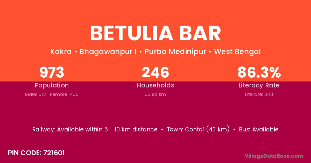 Contai (43 km) is the nearest town to Betulia Bar village for major economic activities and is located approximately 43 km away.