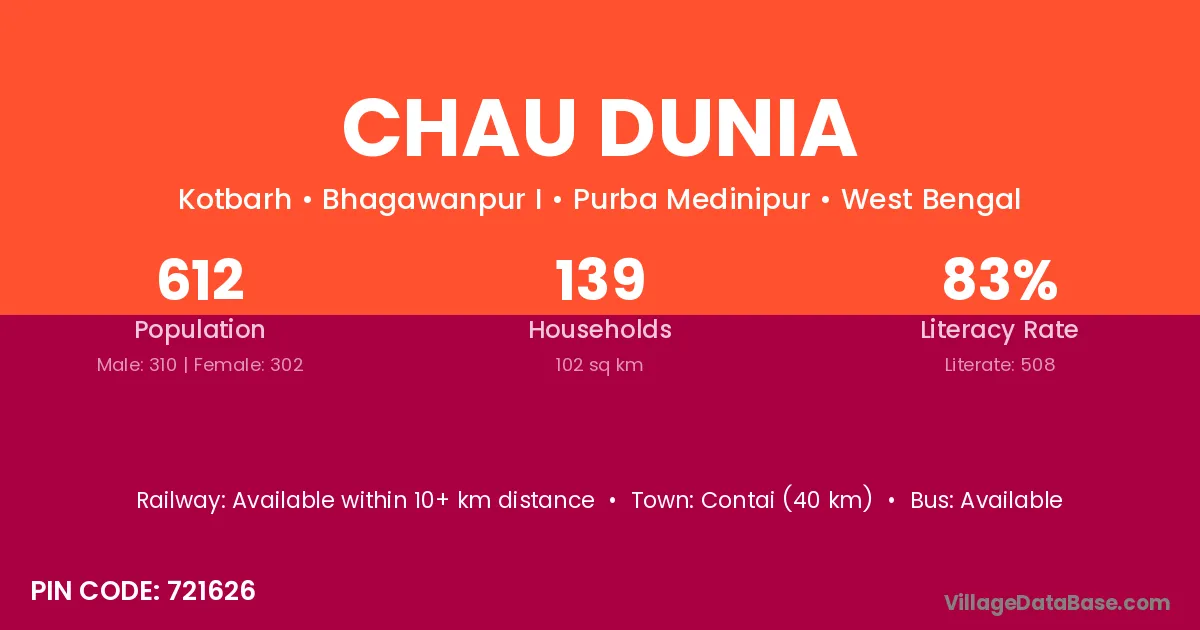 Contai (40 km) is the nearest town to Chau Dunia village for major economic activities and is located approximately 40 km away.
