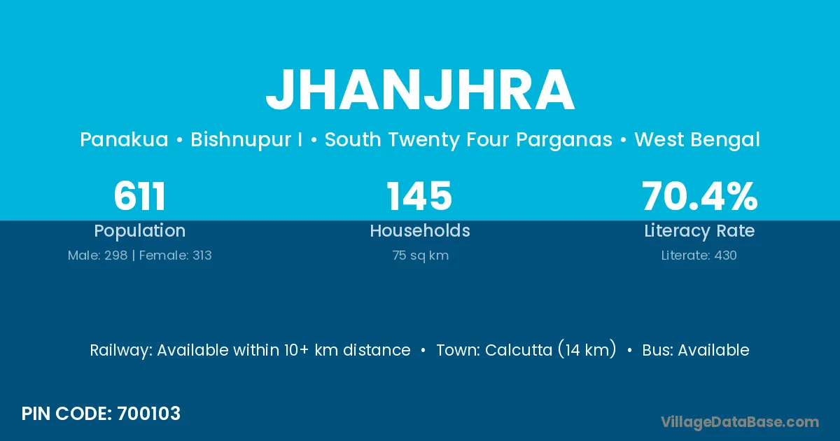 Contai (52 km) is the nearest town to Jhanjhra village for major economic activities and is located approximately 52 km away.