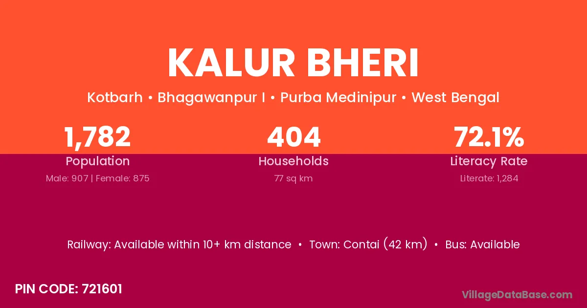 Contai (42 km) is the nearest town to Kalur Bheri village for major economic activities and is located approximately 42 km away.