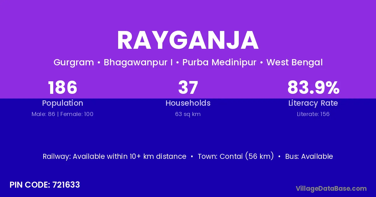 Contai (56 km) is the nearest town to Rayganja village for major economic activities and is located approximately 56 km away.