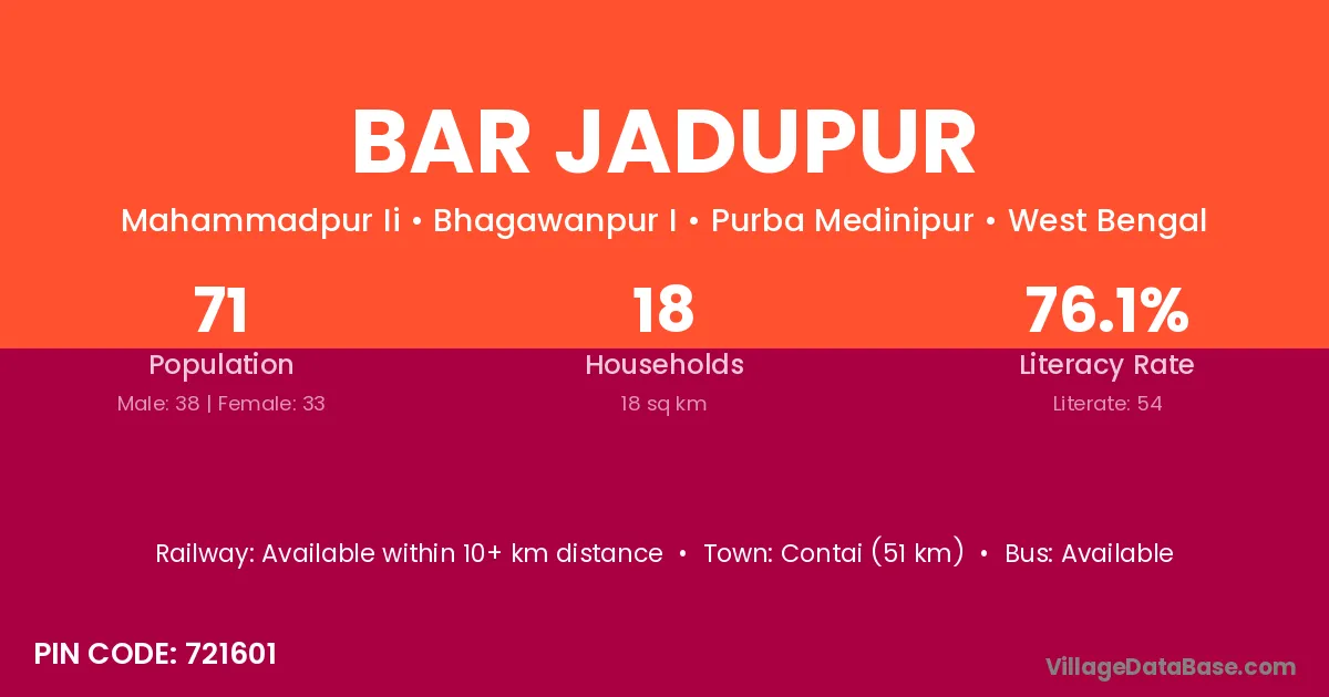 Contai (51 km) is the nearest town to Bar Jadupur village for major economic activities and is located approximately 51 km away.