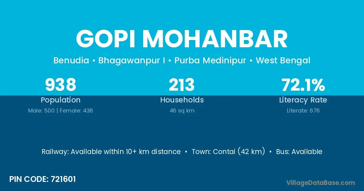 Contai (42 km) is the nearest town to Gopi Mohanbar village for major economic activities and is located approximately 42 km away.