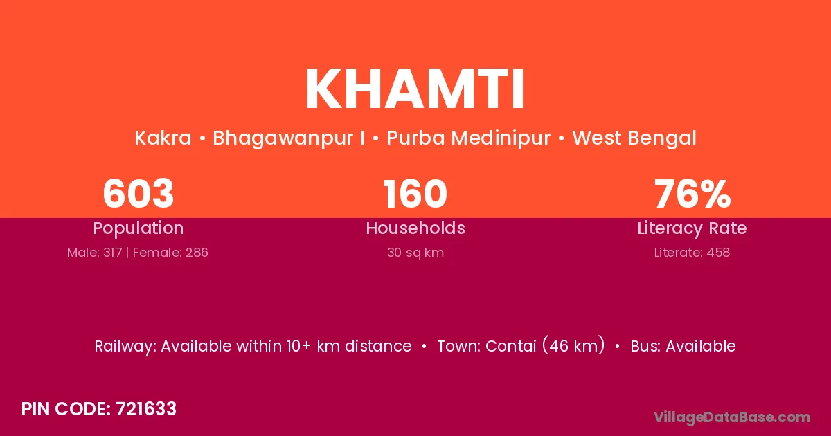 Contai (46 km) is the nearest town to Khamti village for major economic activities and is located approximately 46 km away.