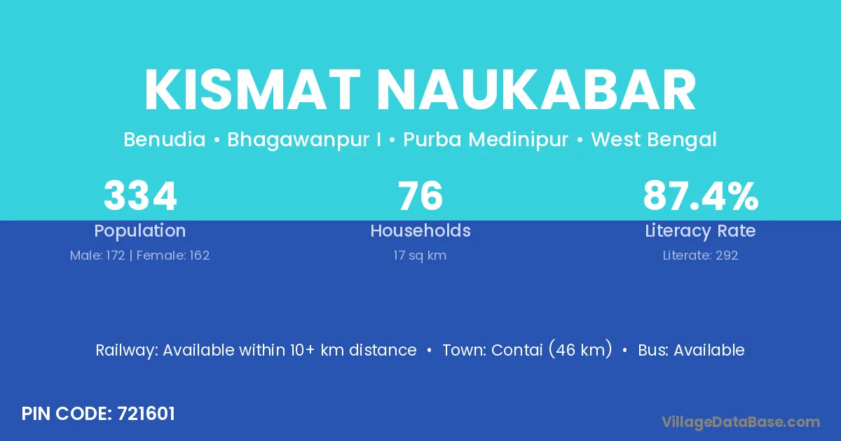 Contai (46 km) is the nearest town to Kismat Naukabar village for major economic activities and is located approximately 46 km away.
