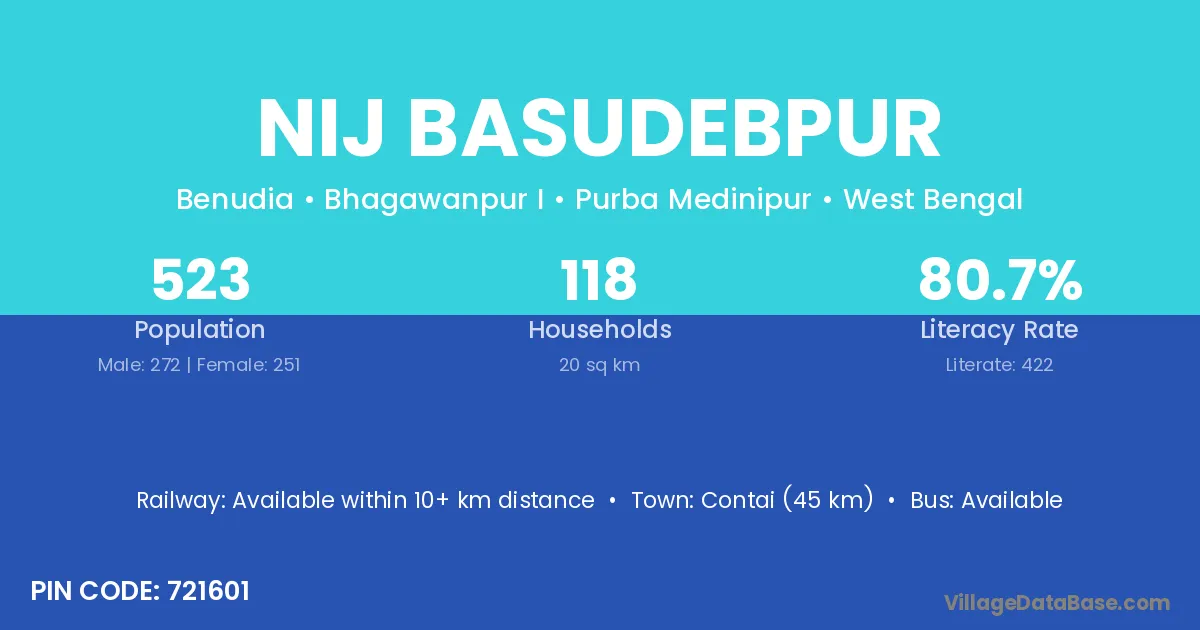 Contai (45 km) is the nearest town to Nij Basudebpur village for major economic activities and is located approximately 45 km away.