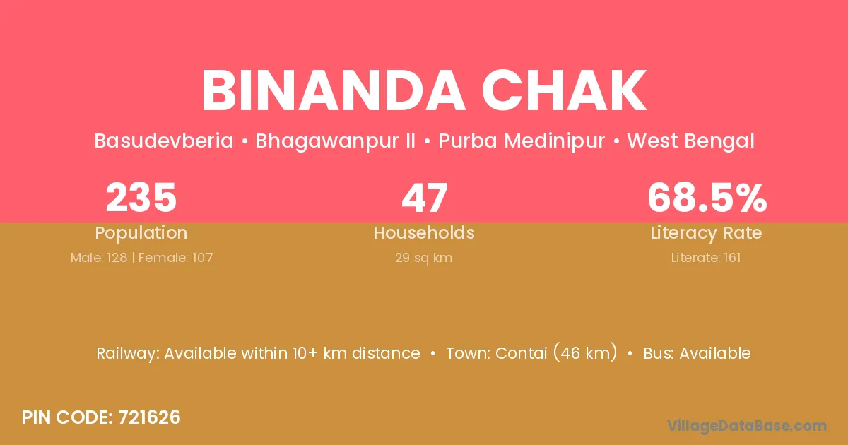 Contai (46 km) is the nearest town to Binanda Chak village for major economic activities and is located approximately 46 km away.