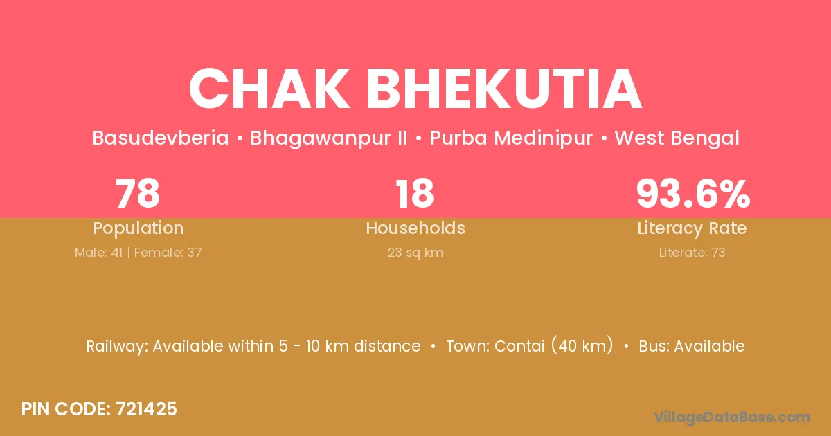 Contai (40 km) is the nearest town to Chak Bhekutia village for major economic activities and is located approximately 40 km away.