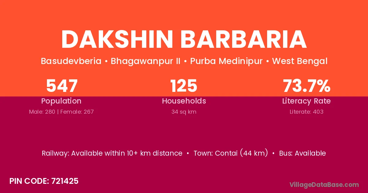 Contai (44 km) is the nearest town to Dakshin Barbaria village for major economic activities and is located approximately 44 km away.