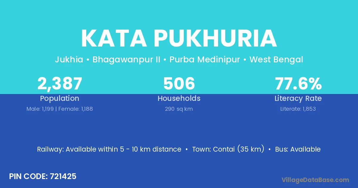 Contai (35 km) is the nearest town to Kata Pukhuria village for major economic activities and is located approximately 35 km away.