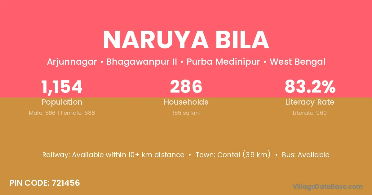 Contai (39 km) is the nearest town to Naruya Bila village for major economic activities and is located approximately 39 km away.