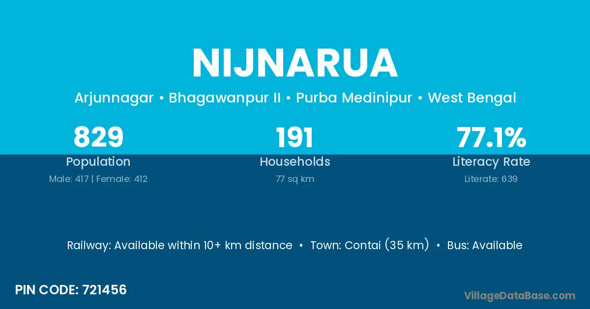 Contai (35 km) is the nearest town to Nijnarua village for major economic activities and is located approximately 35 km away.