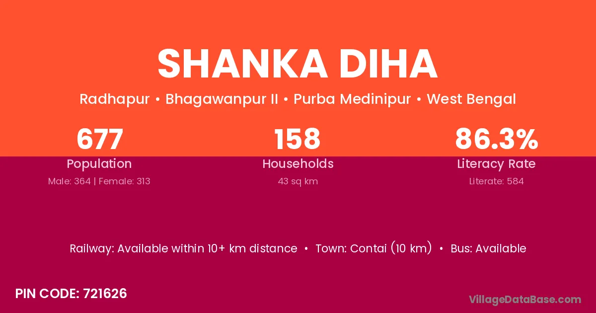 Contai (10 km) is the nearest town to Shanka Diha village for major economic activities and is located approximately 10 km away.
